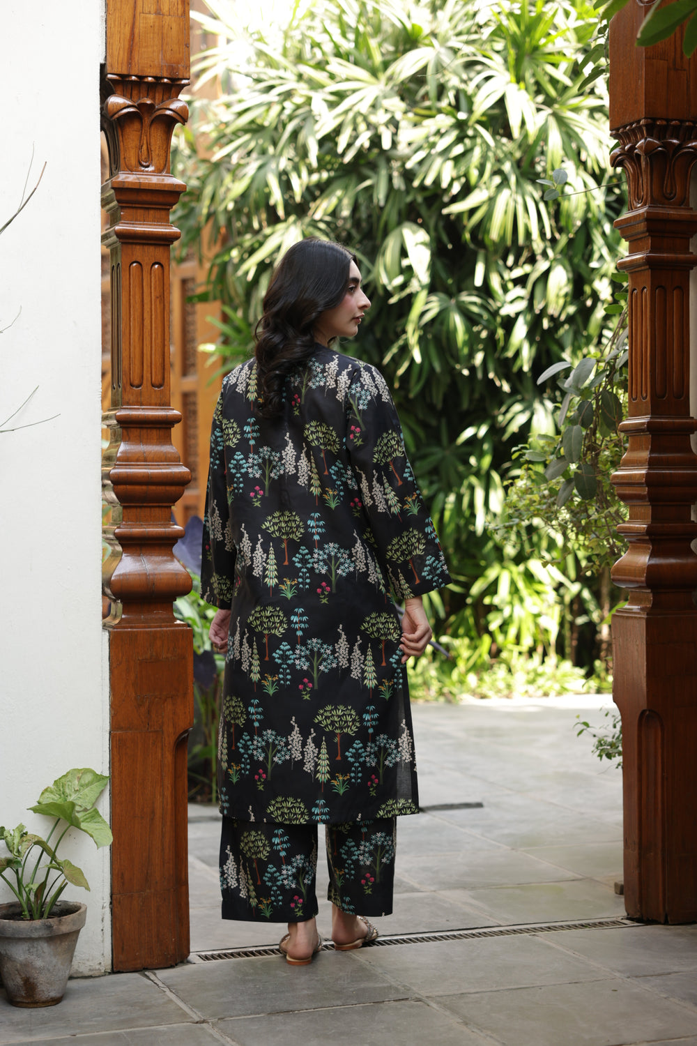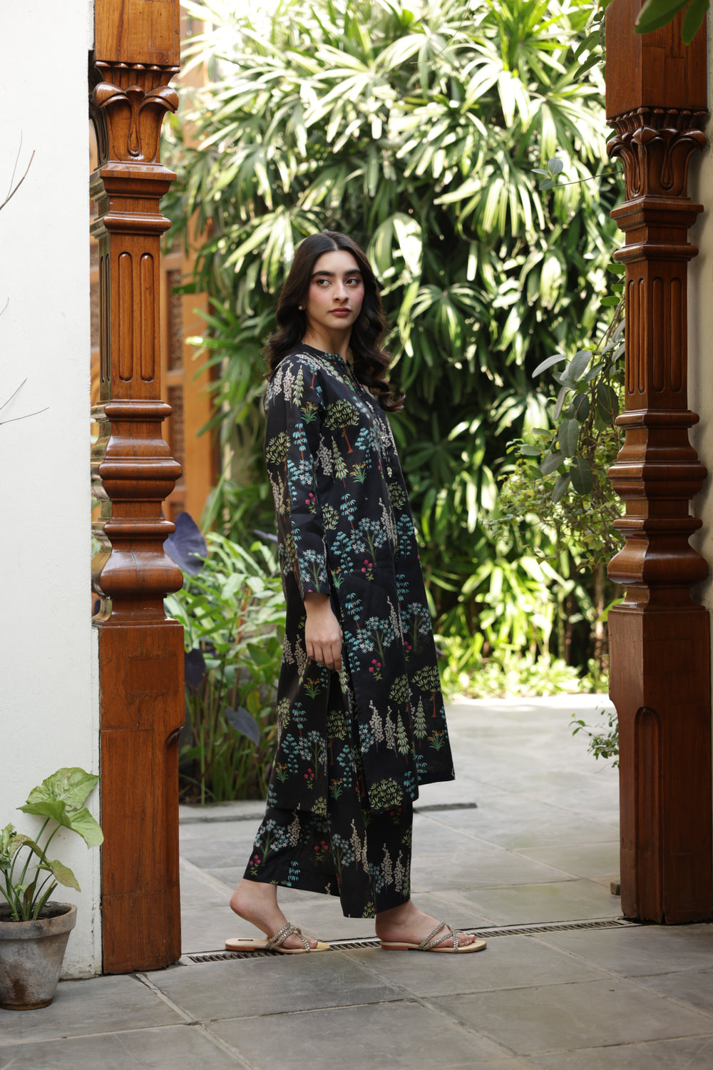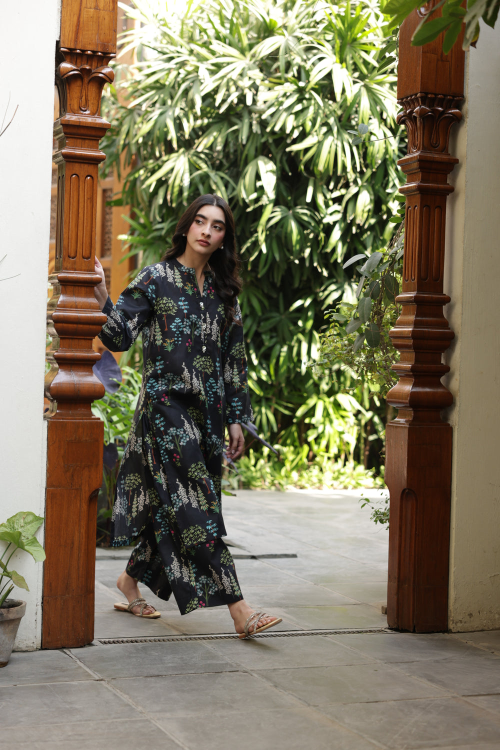 Embody cheeky sophistication in this exquisite black co-ord set. This effortless silhouette features a colorful floral and botanical print, adding a playful