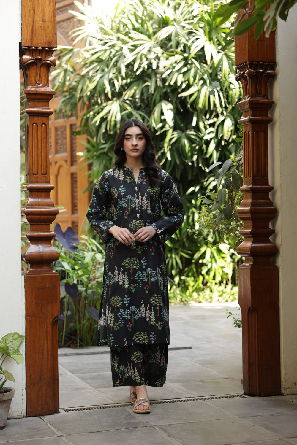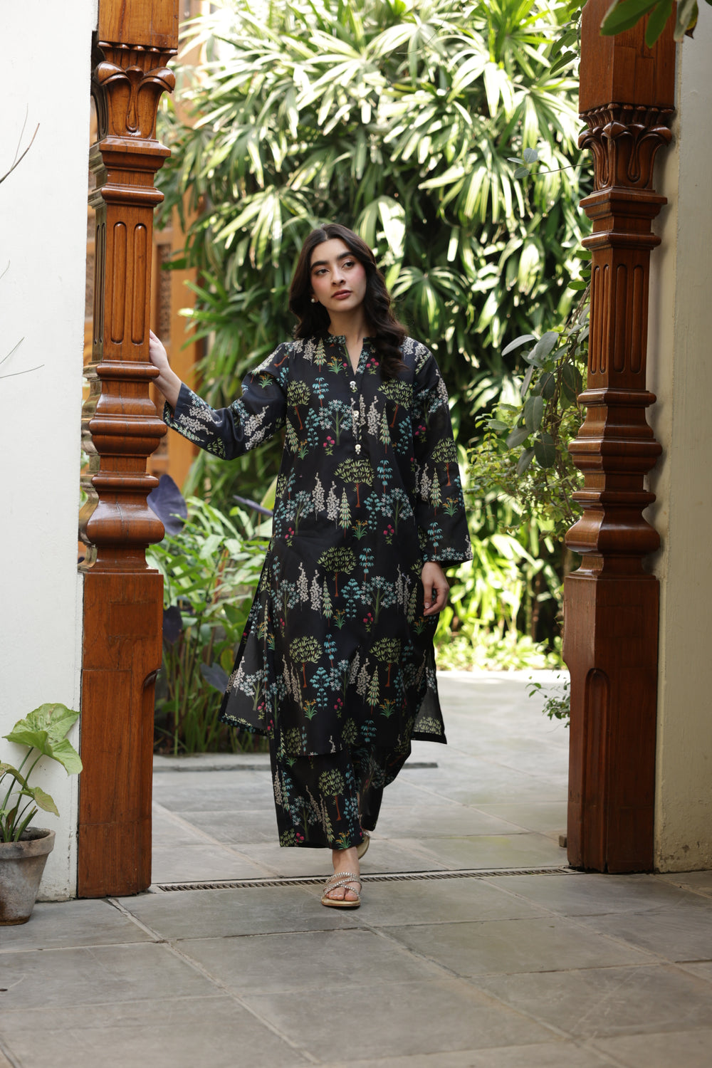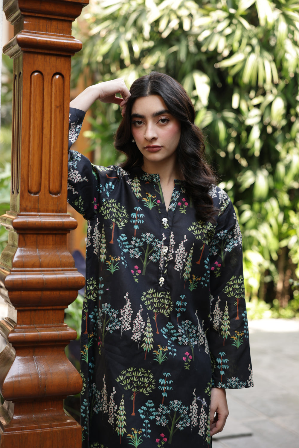 Embody cheeky sophistication in this exquisite black co-ord set. This effortless silhouette features a colorful floral and botanical print, adding a playful