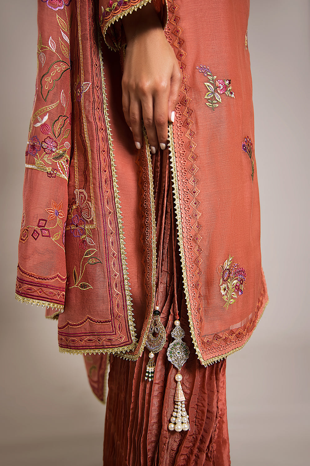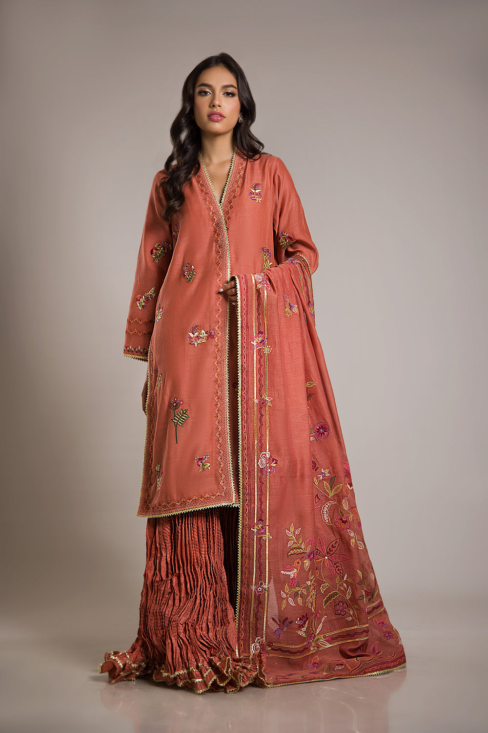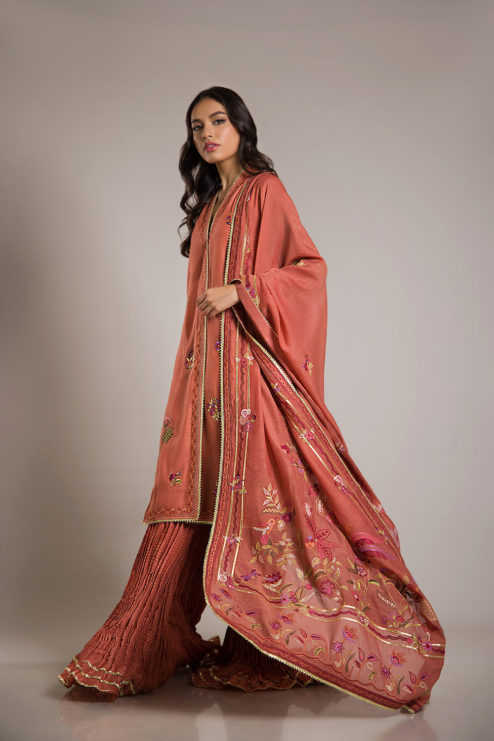 Experience the beauty of modern style with MURJAN. Featuring a sleek and modern line cut, it is embroidered and adorned with a unique and intricate pattern. Its flowy dupatta completes the perfect ensemble for any gathering. Crafted from the finest materials, this angarkha is designed for the modern woman.