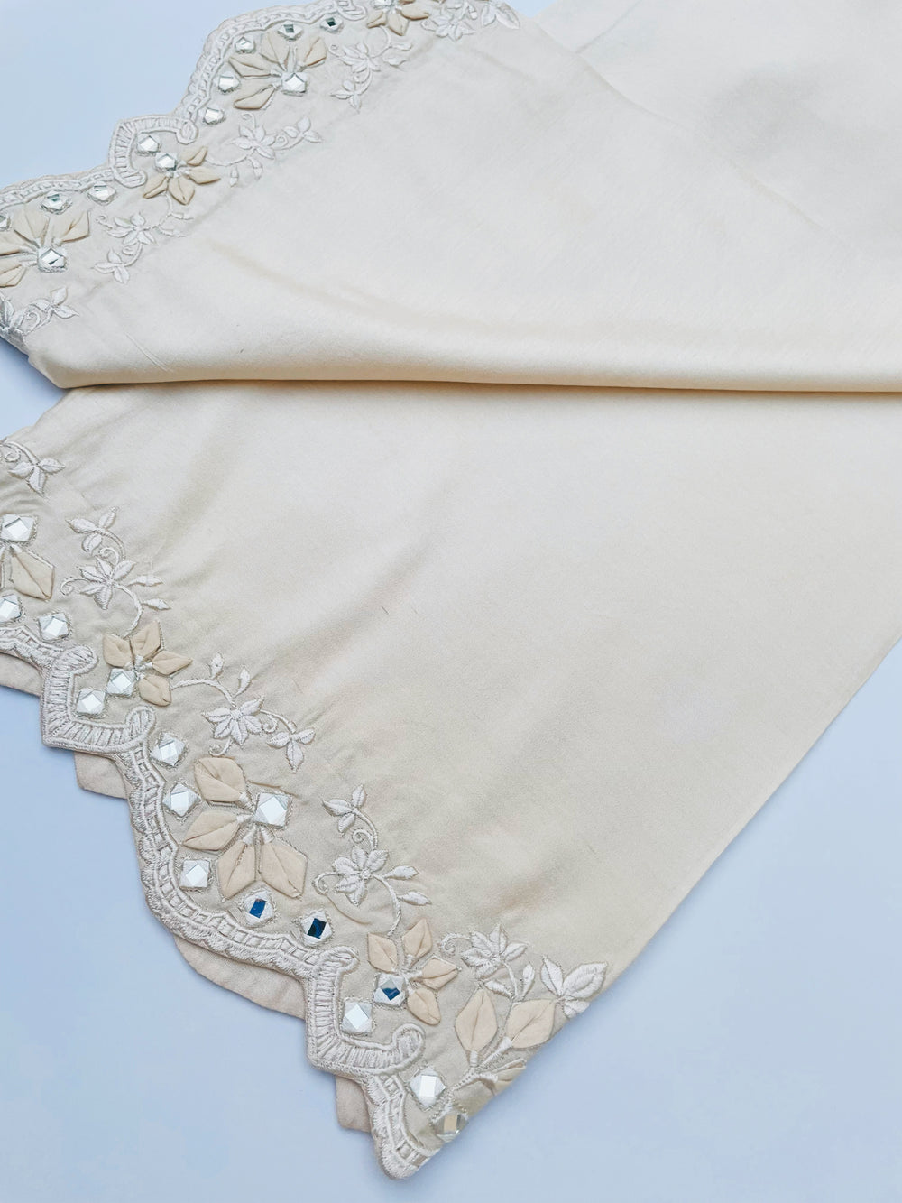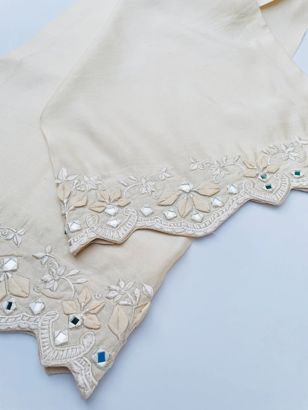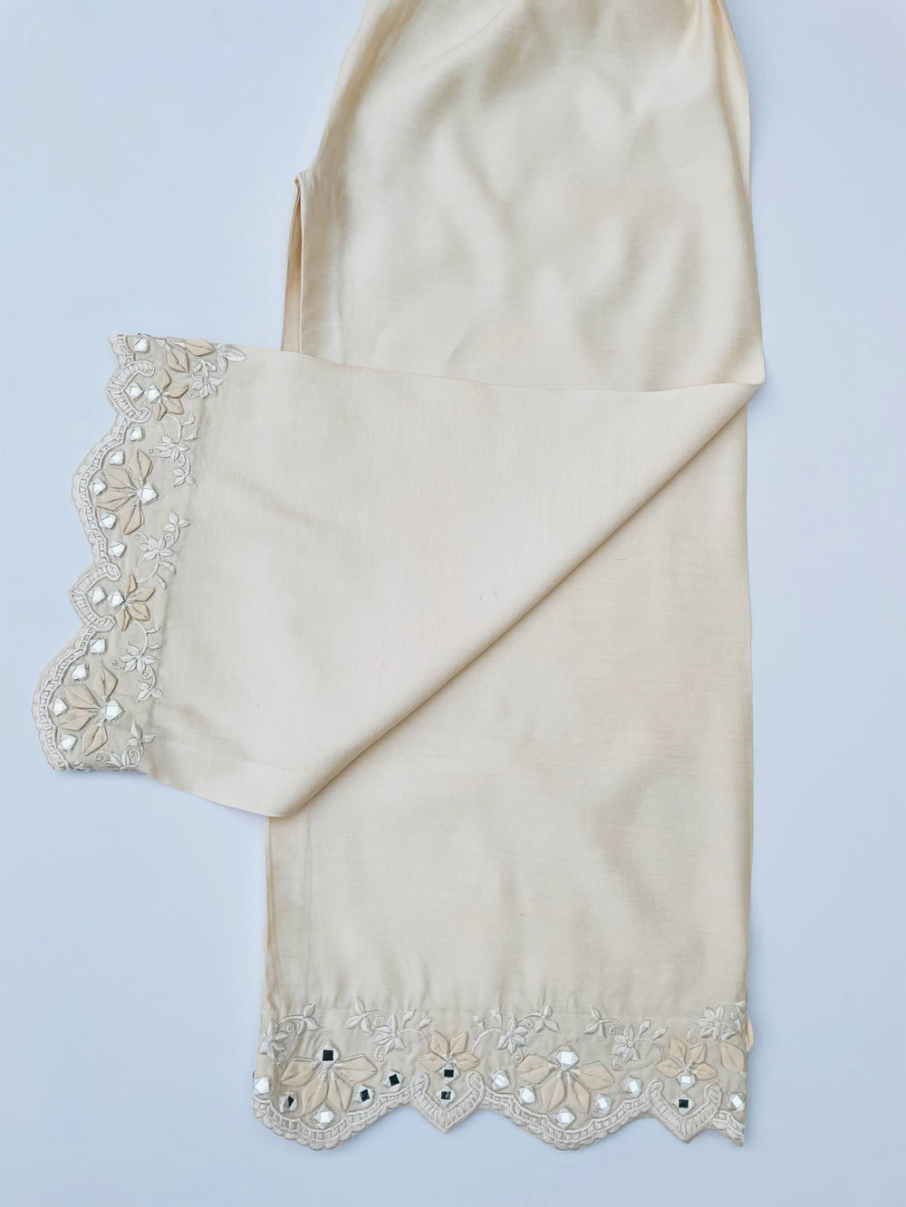 Look stunning in this traditional IZAAR, featuring a comfortable ivory fabric with intricate applique and mirror work that will complement any outfit. Crafted with premium fabrics and detailed embellishments, this izaar will add a touch of class to your wardrobe.