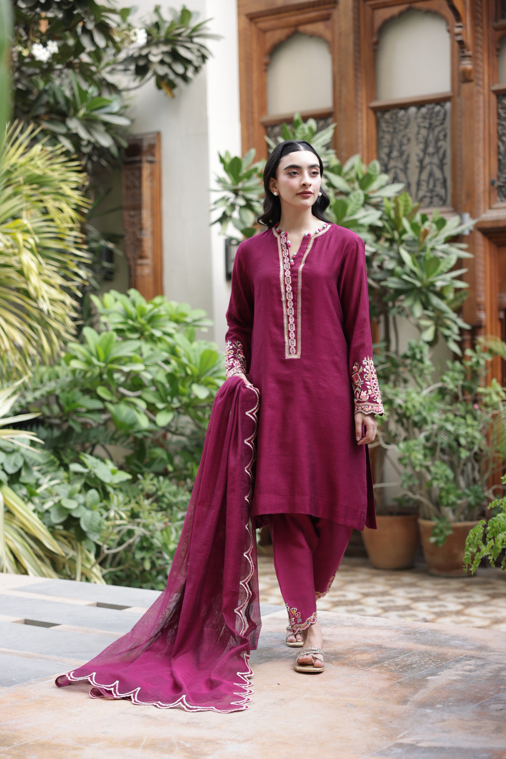 with tapered embroidered shalwar. It is complimented with