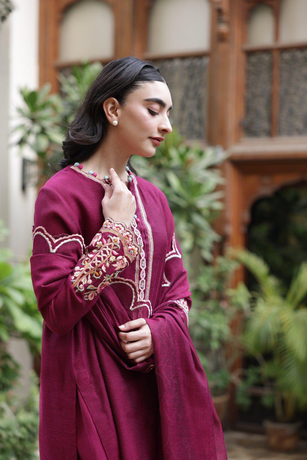 The shirt showcases intricate thread embroidery, highlighting