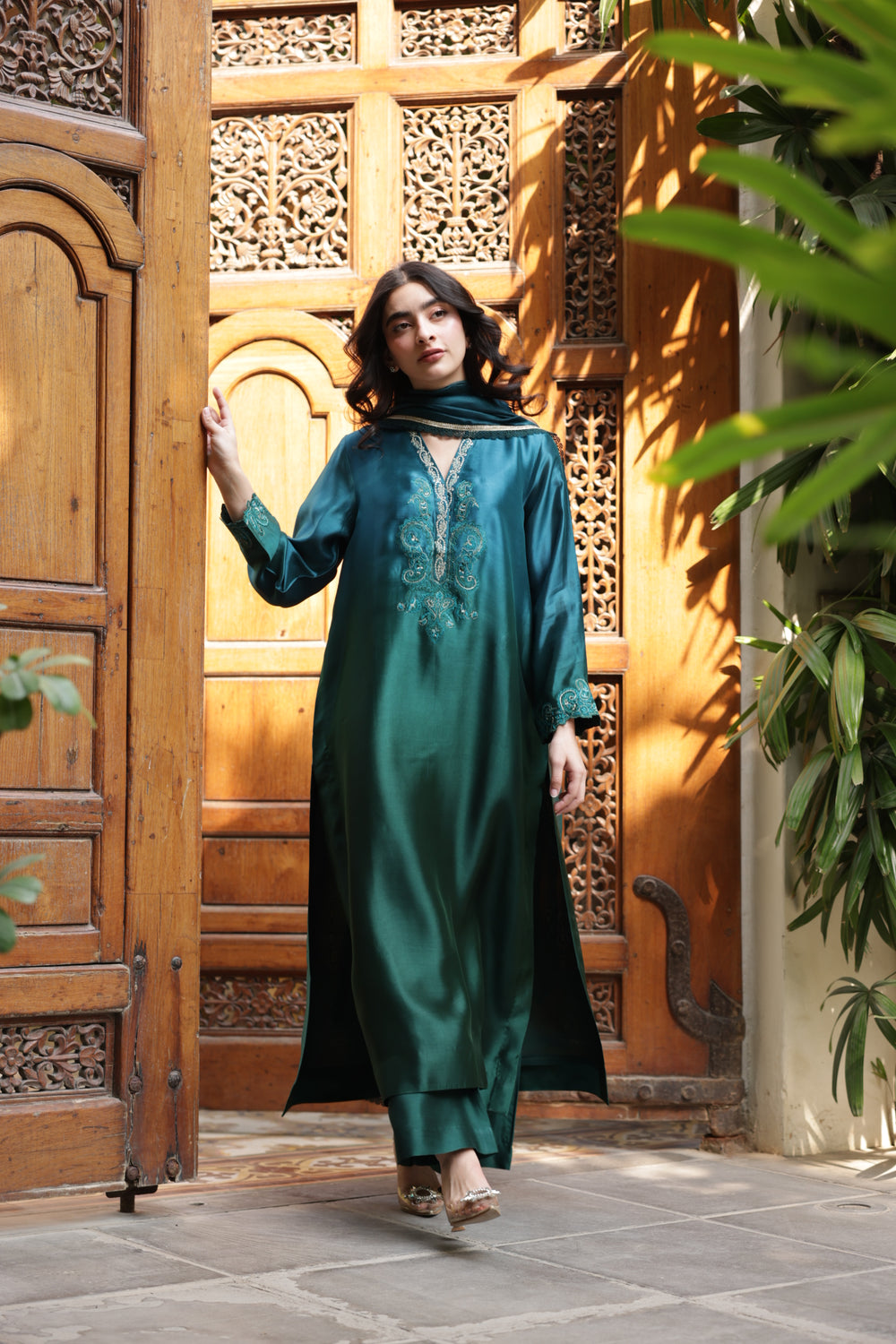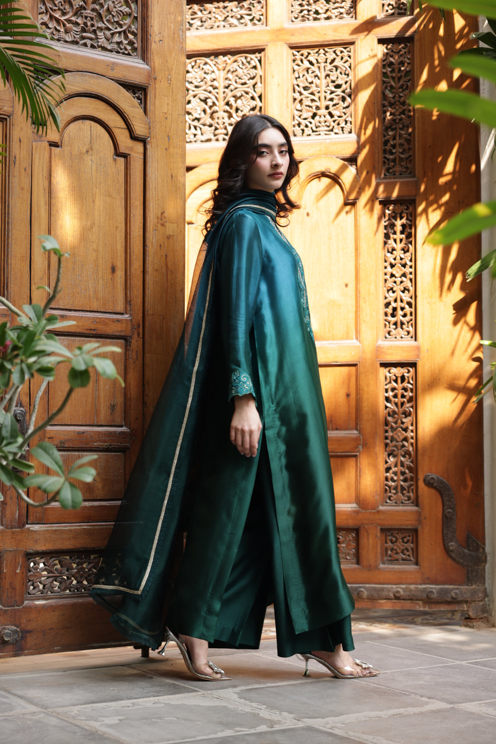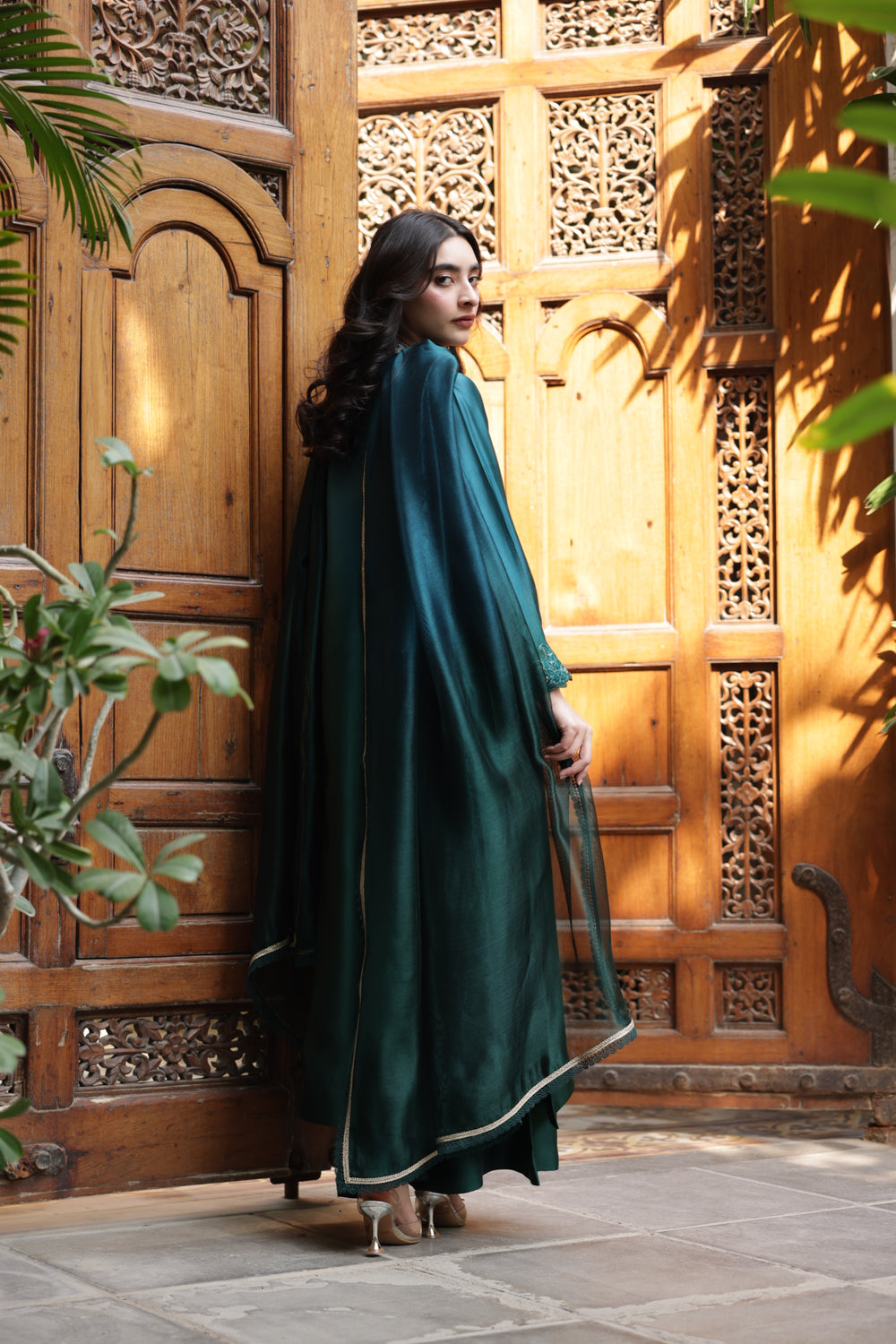 The outfit is crafted in stunning peacock green and