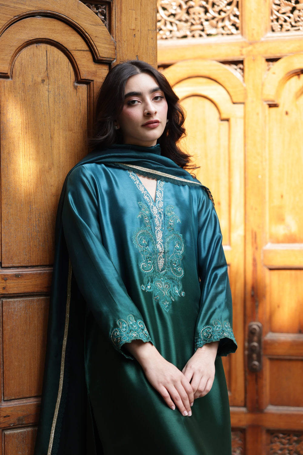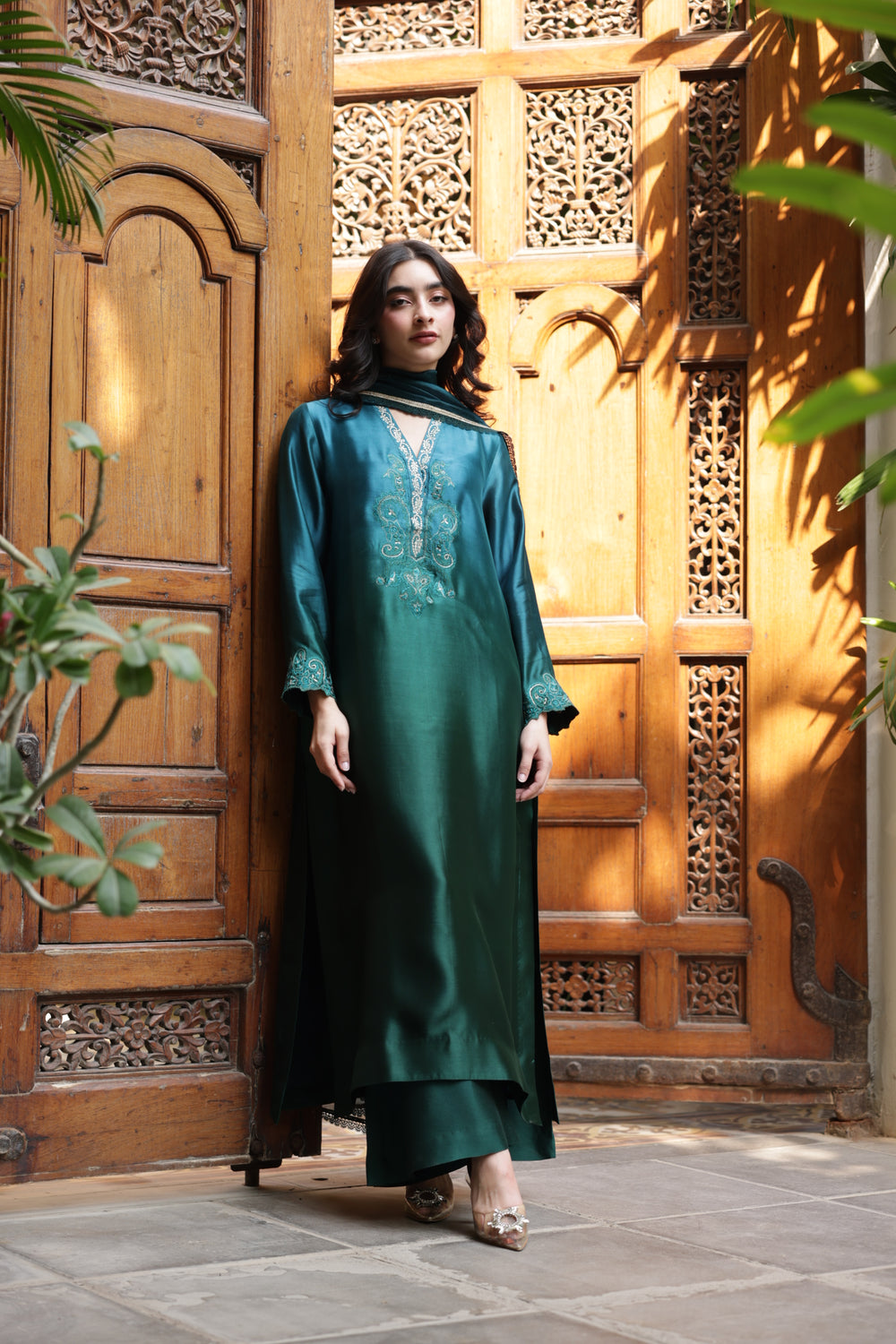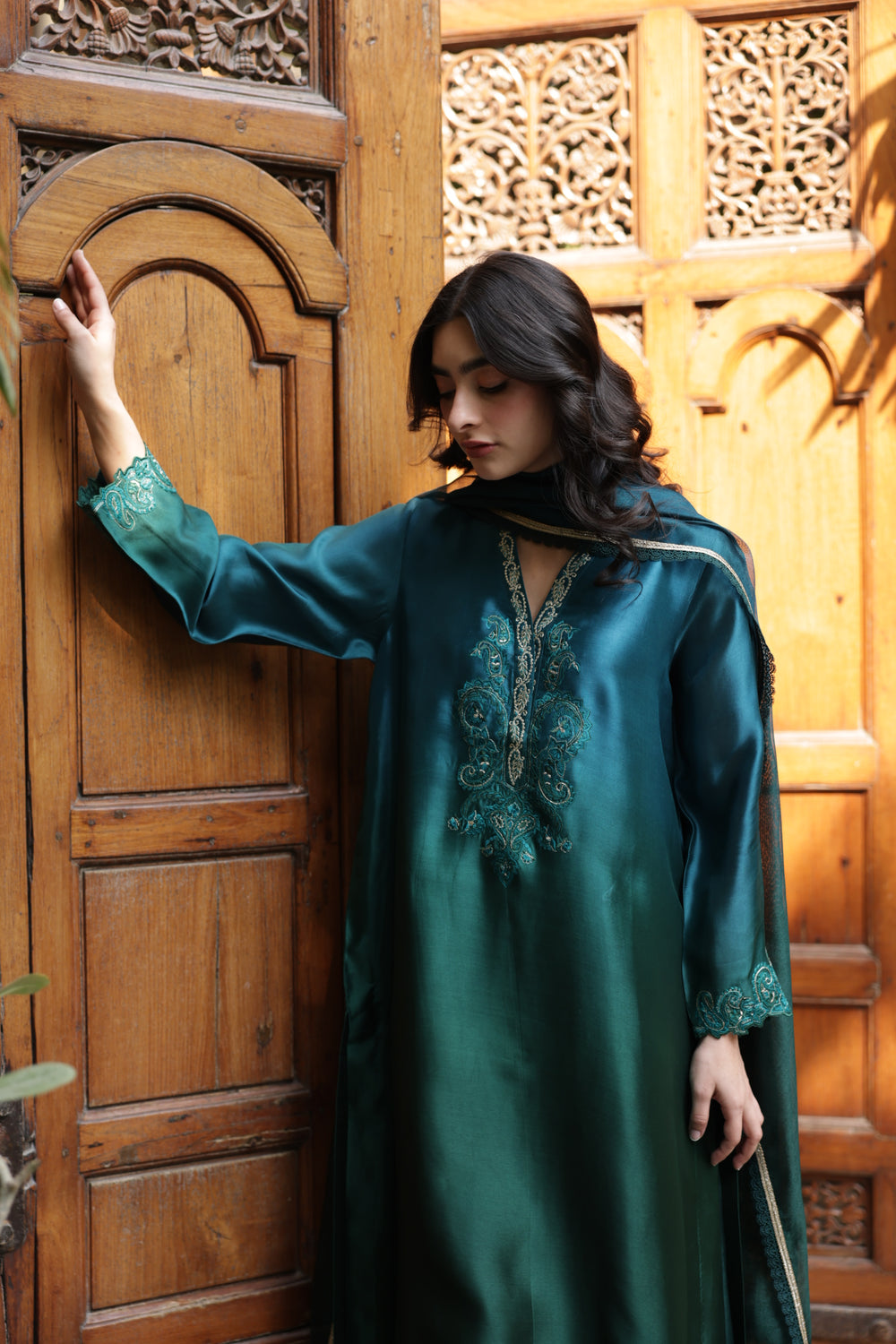The outfit is crafted in stunning peacock green and