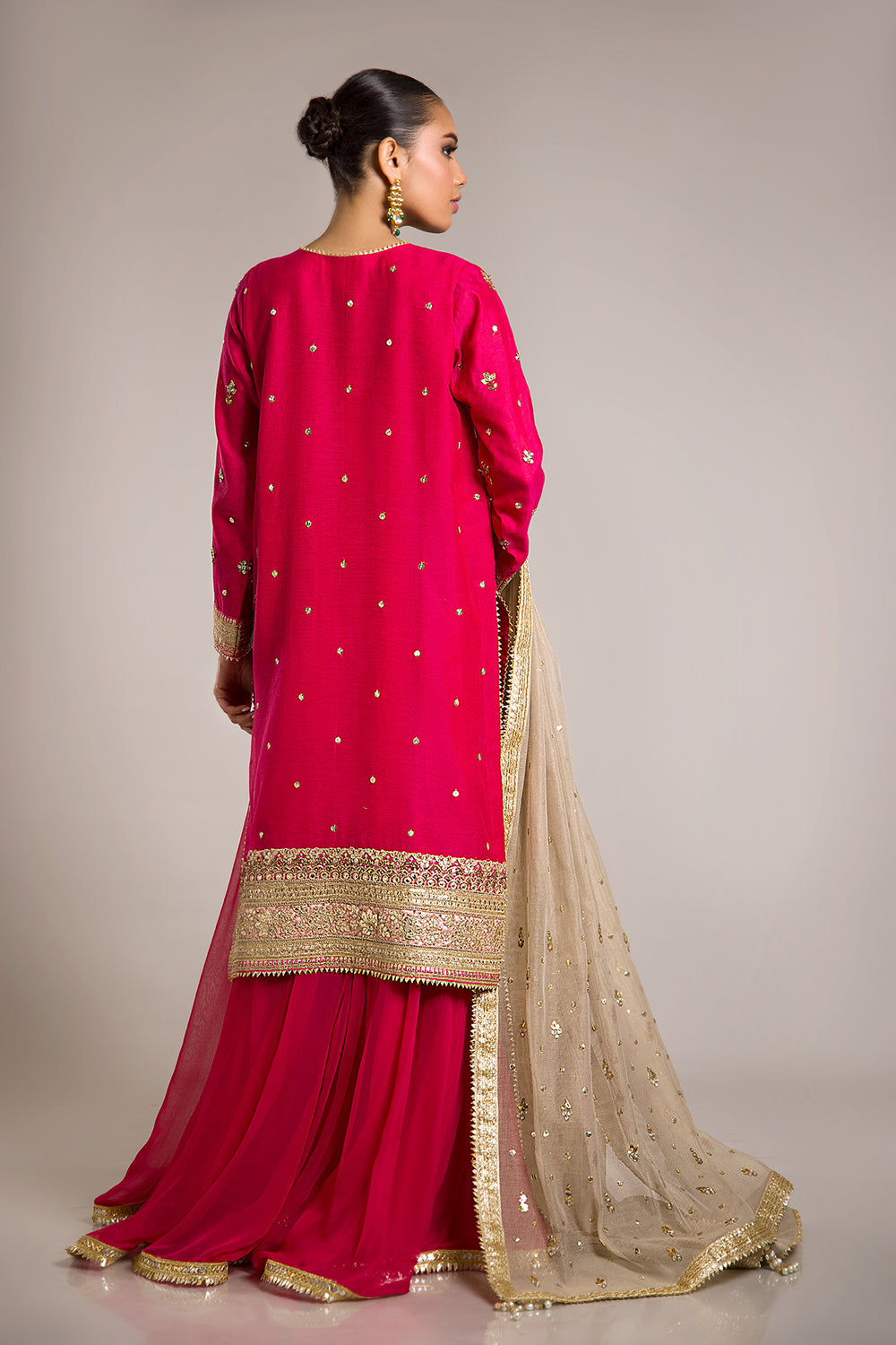 Introducing SHABNAM, a stylish chiffon gharara featuring a flowy silhouette. To finish the look, the garment is sold separately to make your outfit look extra grand. Can be viewed in bottom section.