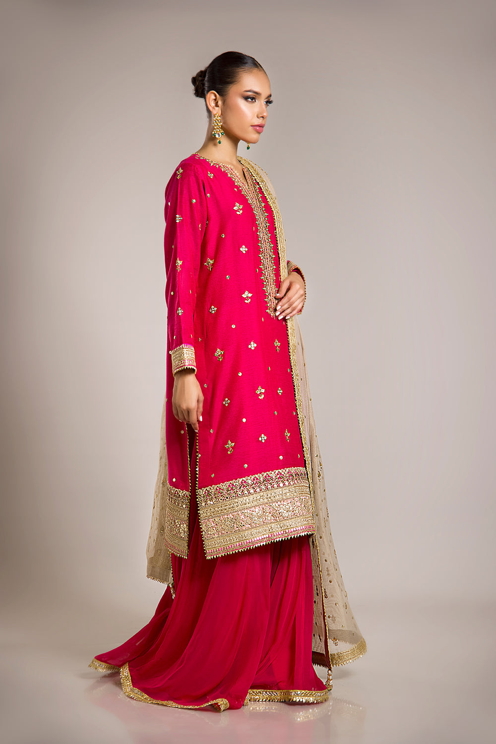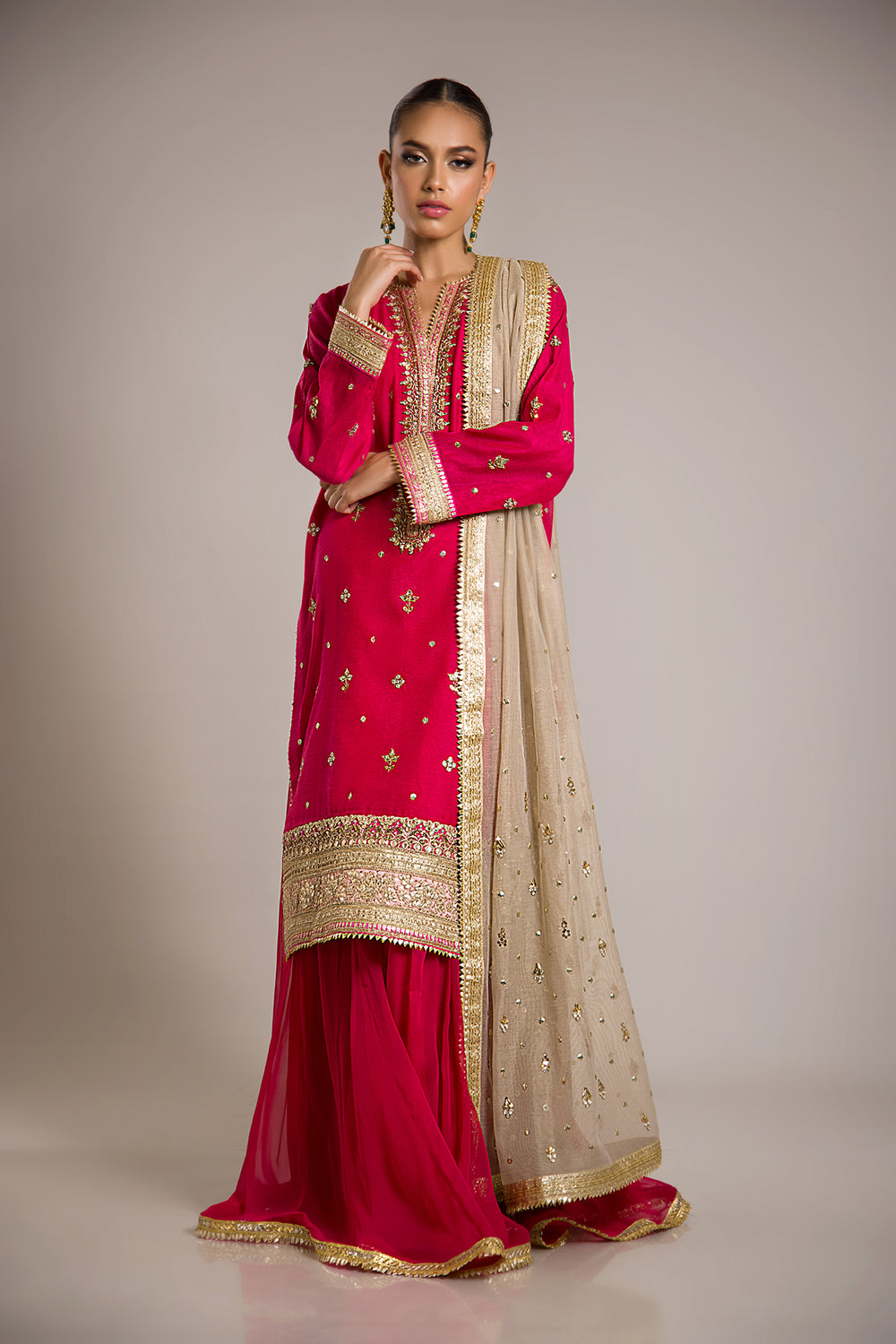 This gorgeous SHABNAM ensemble is the perfect balance of traditional elegance and modern sophistication. This ensemble includes a shirt and dupatta, both hand-embroidered with intricate detail and a bold border. The finish is flawlessly completed with a gota lace trim. Wear it to make a statement at any special occasion.