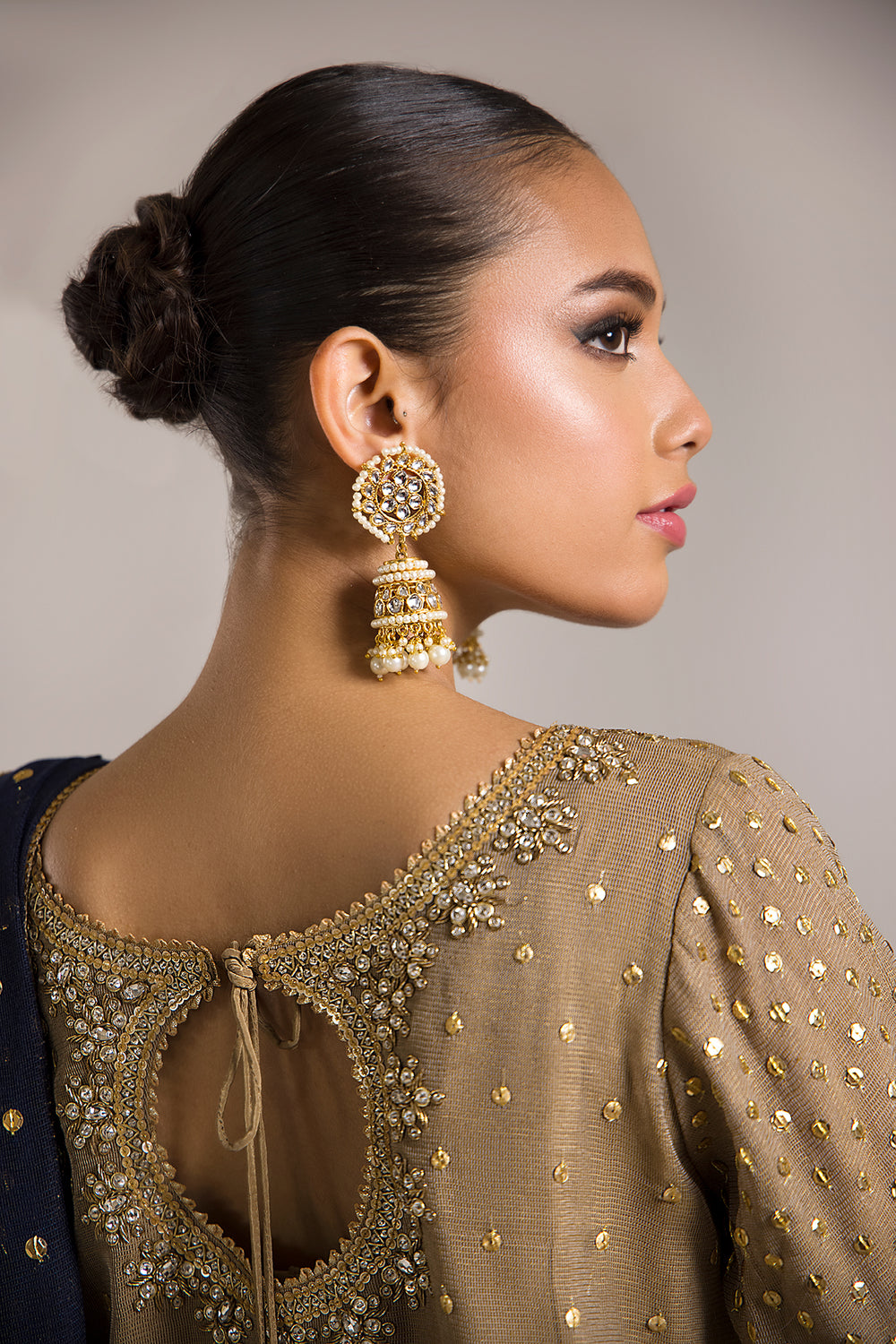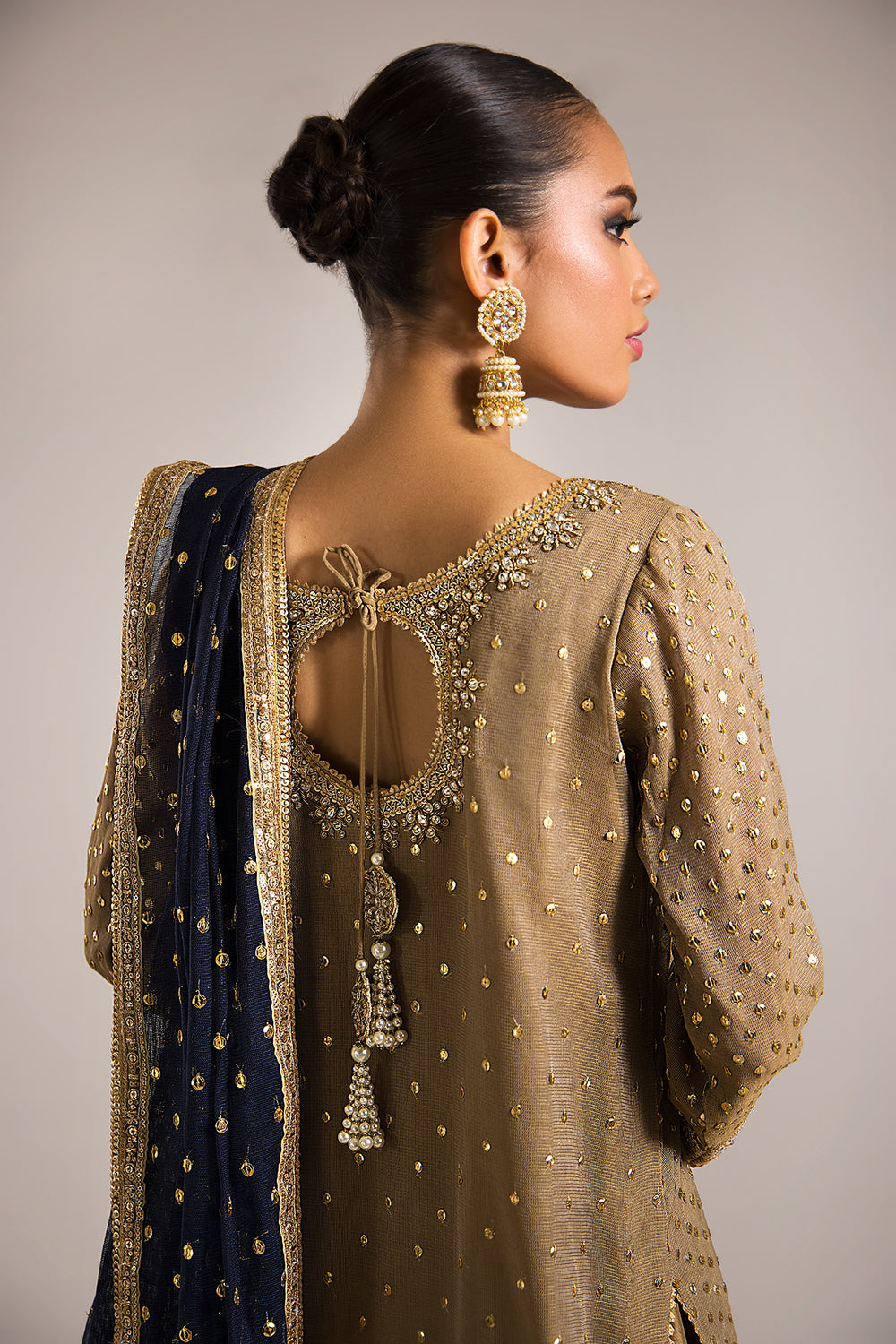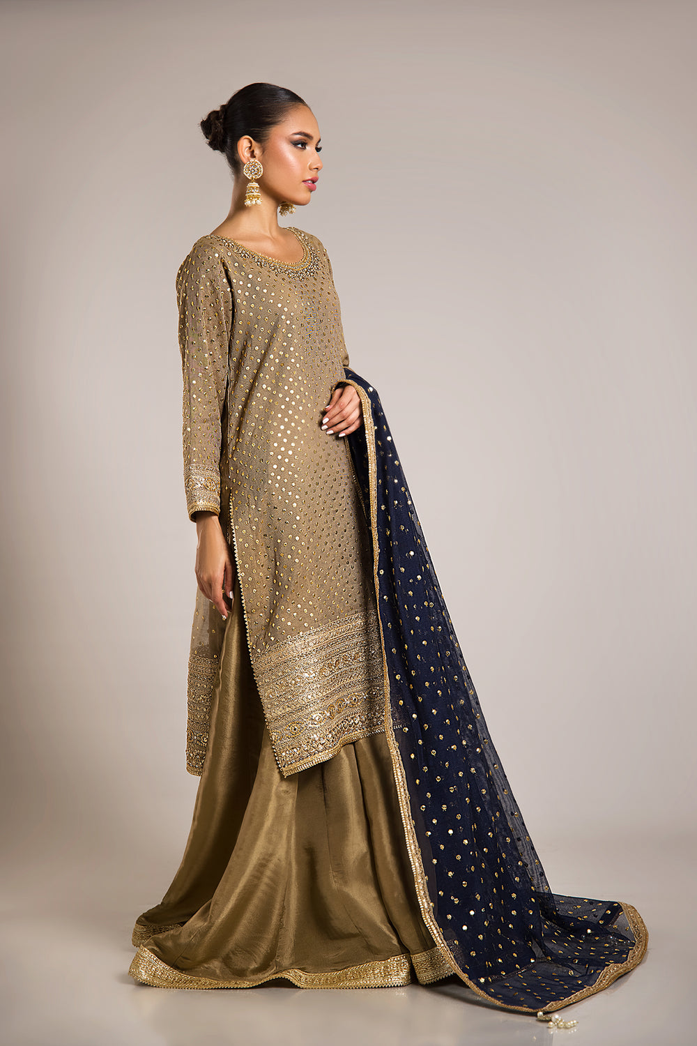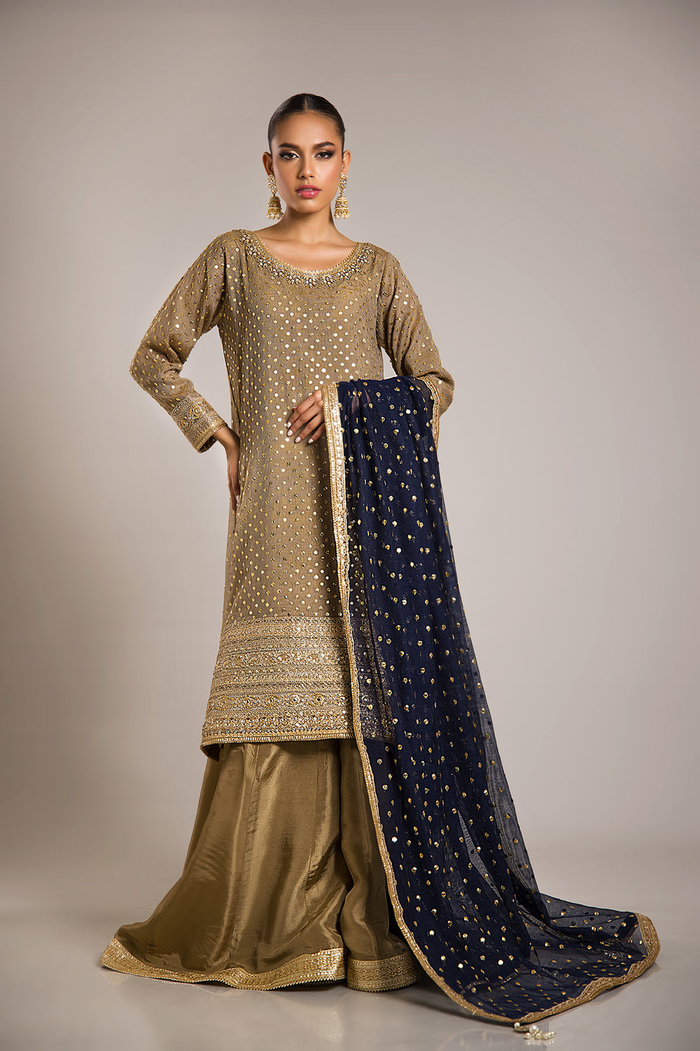 SITARA is a traditional straight shirt features back neckline with beautiful stones work and tassels. The shirt is adorned with heavily sequined work, as well as hand embroideries and gota for a detailed, eye-catching design. The look is completed with an intricately designed dupatta, making it the ideal ensemble for a special event.
