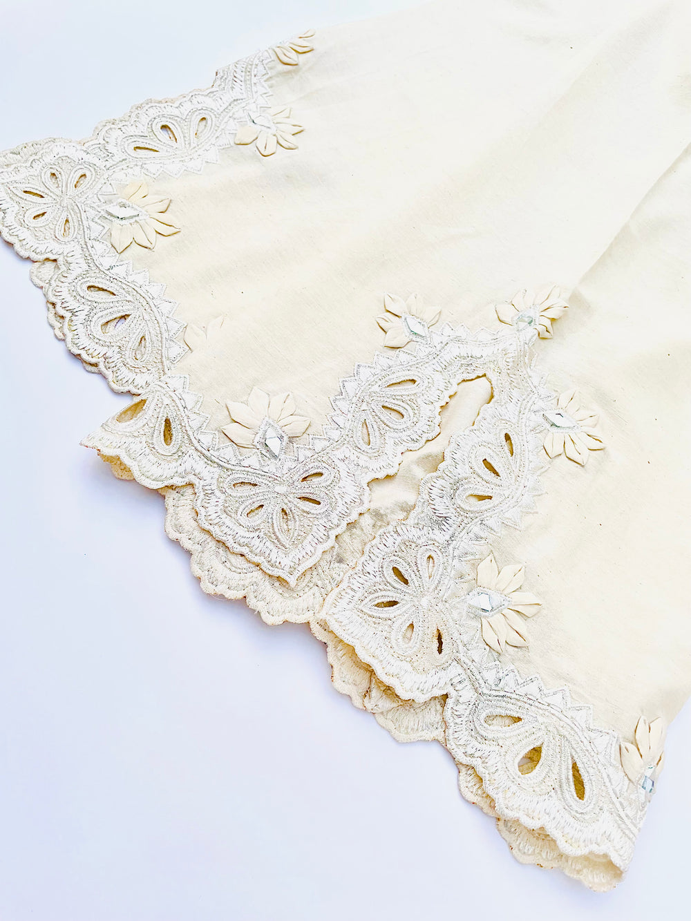 Look stunning in this traditional IZAAR, featuring a comfortable ivory fabric with intricate applique and mirror work that will complement any outfit. Crafted with premium fabrics and detailed embellishments, this izaar will add a touch of class to your wardrobe.
